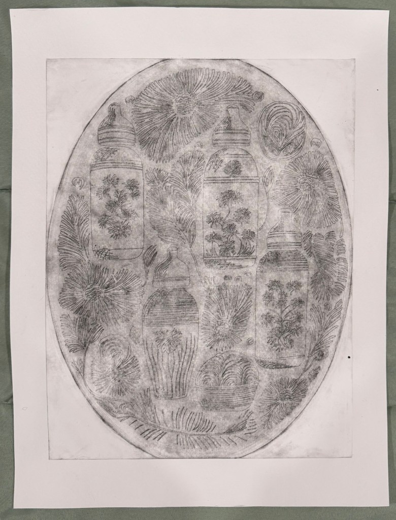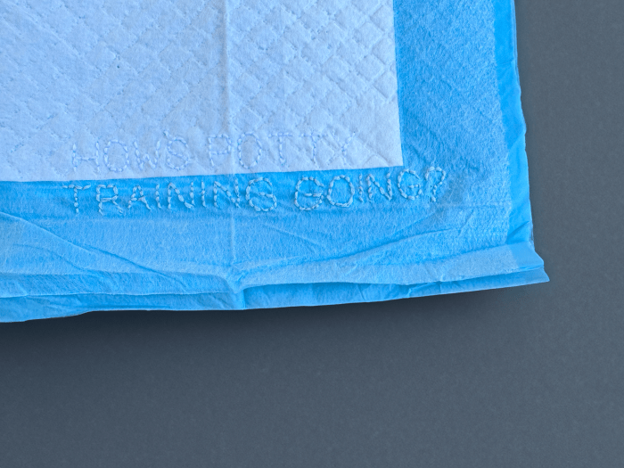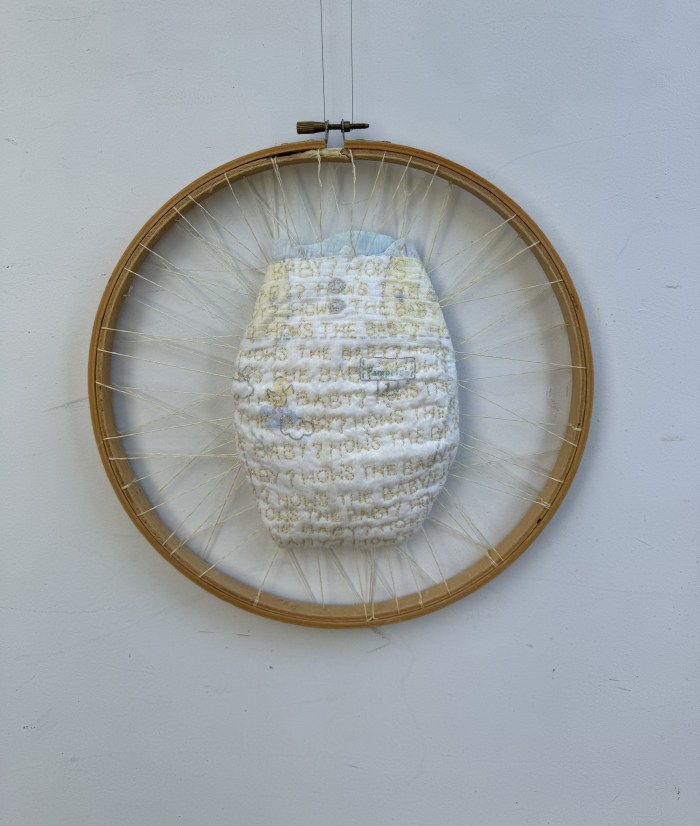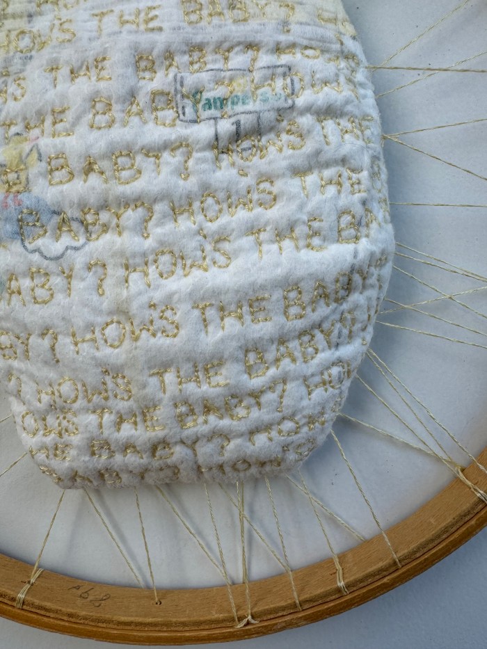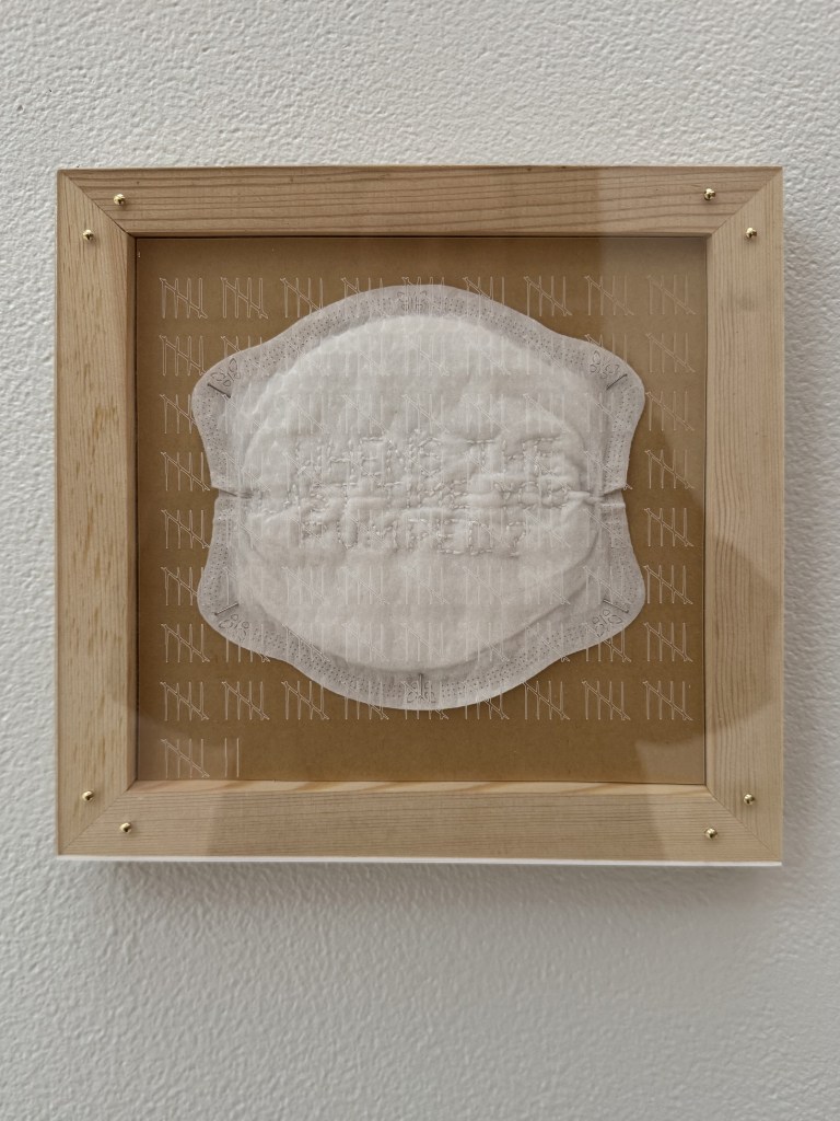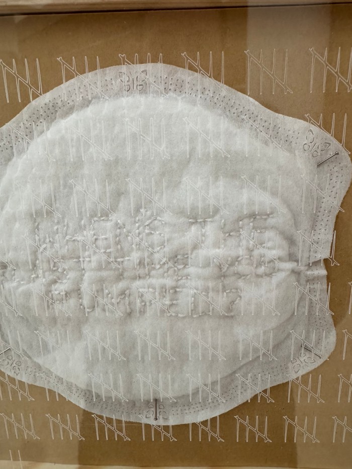 Embroidery on disposable breast pad, wooden frame, etched plexiglass
