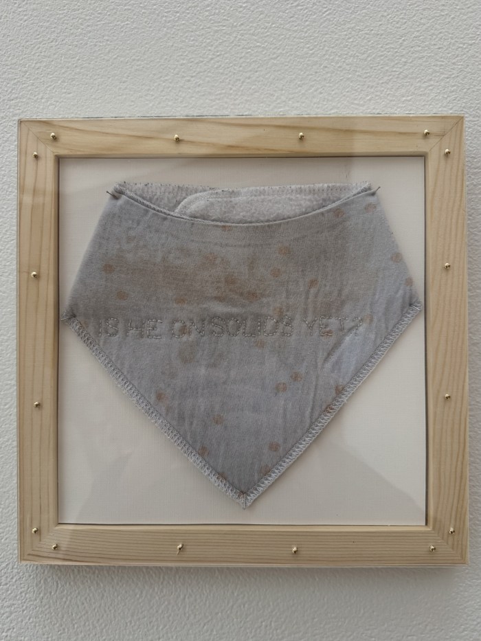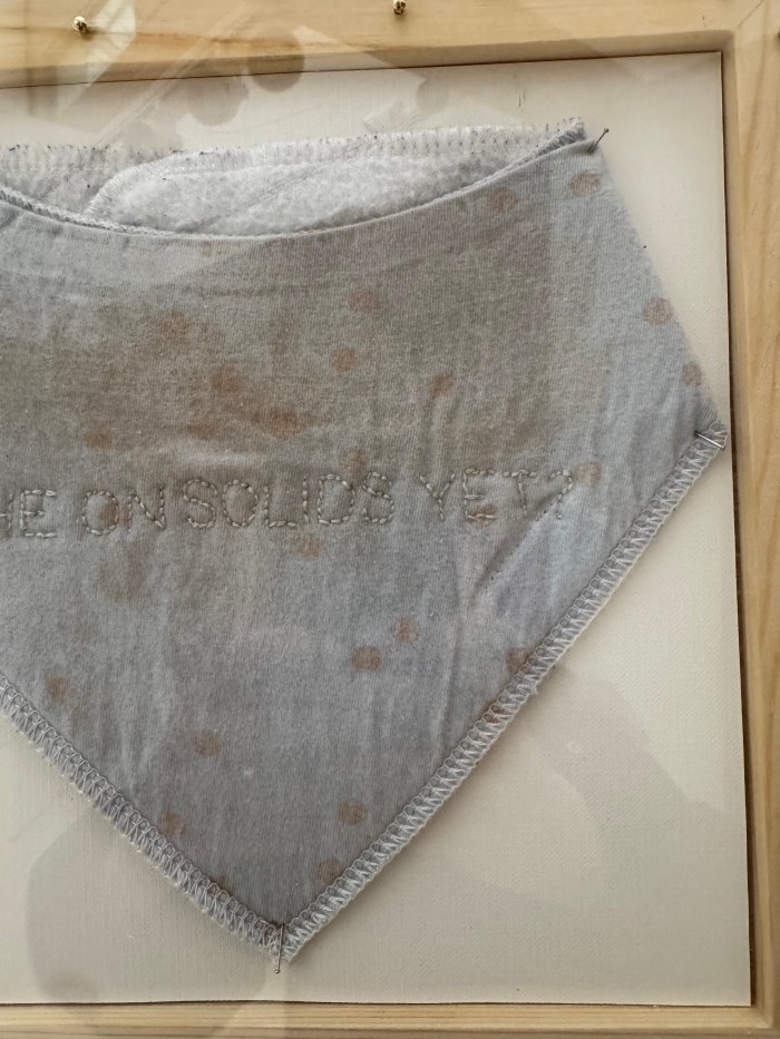 Embroidery on cloth infant bib, wooden frame, plexiglass