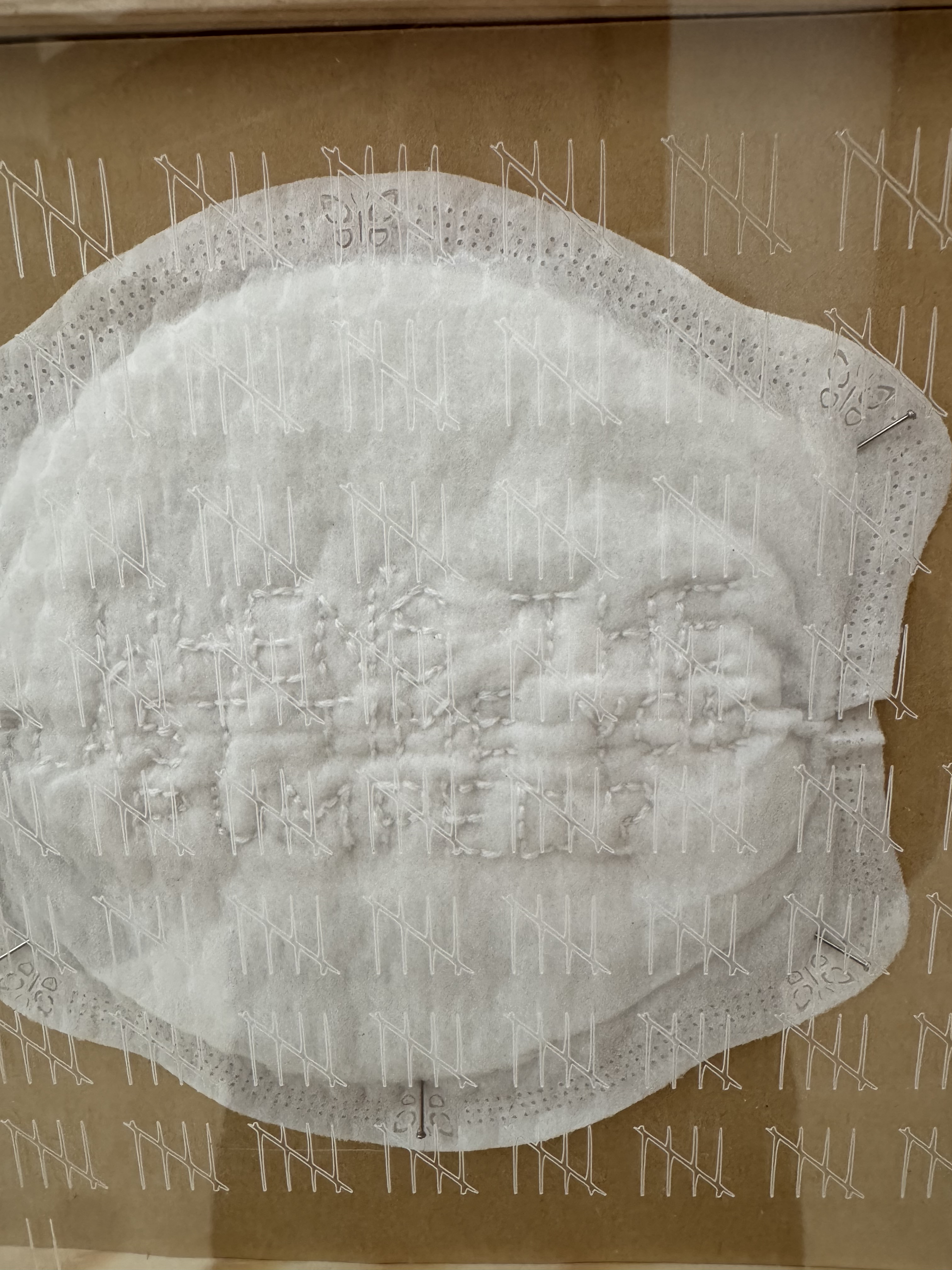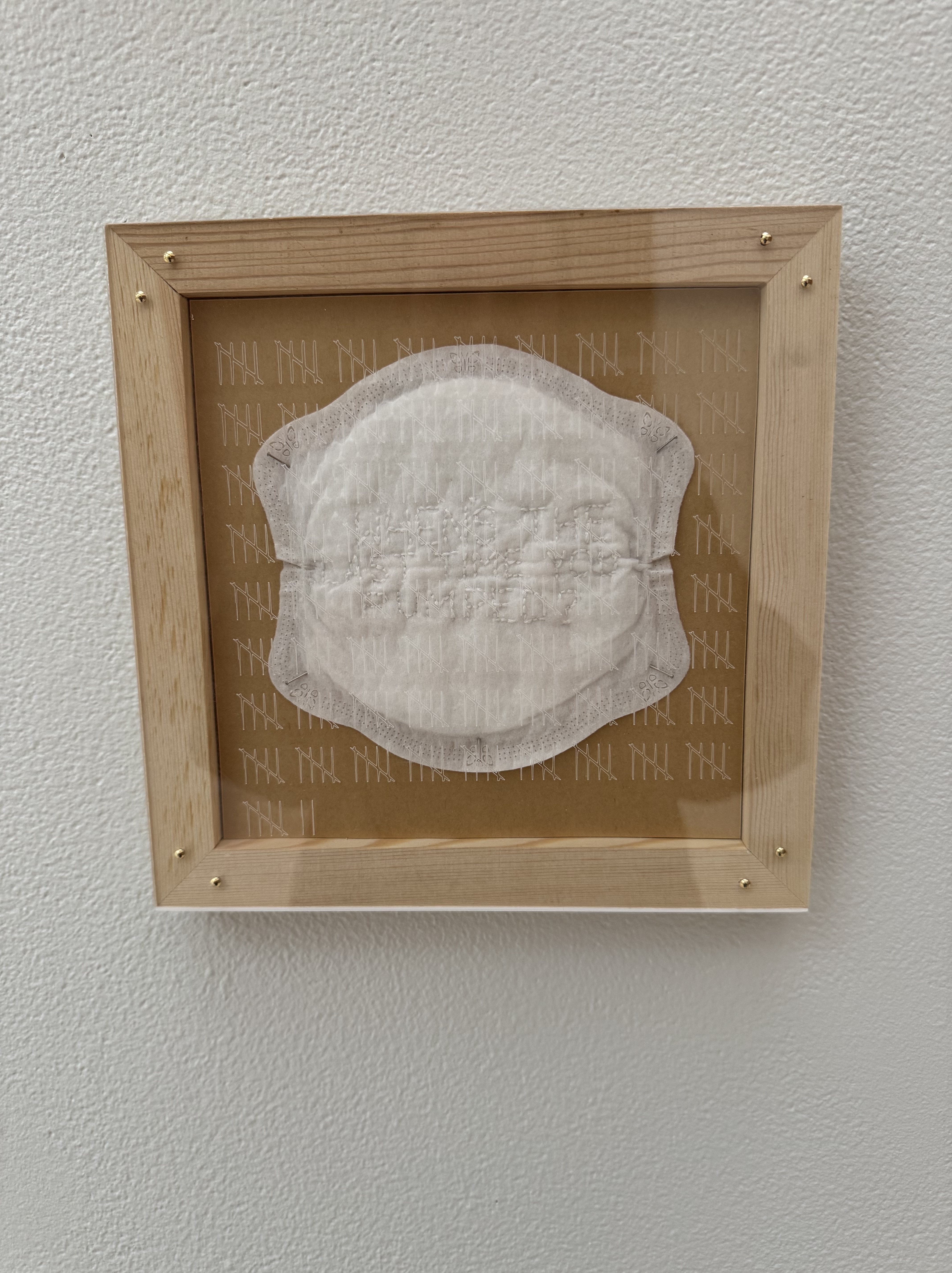 Embroidery thread on disposable nursing pad, wood frame, etched plexiglass