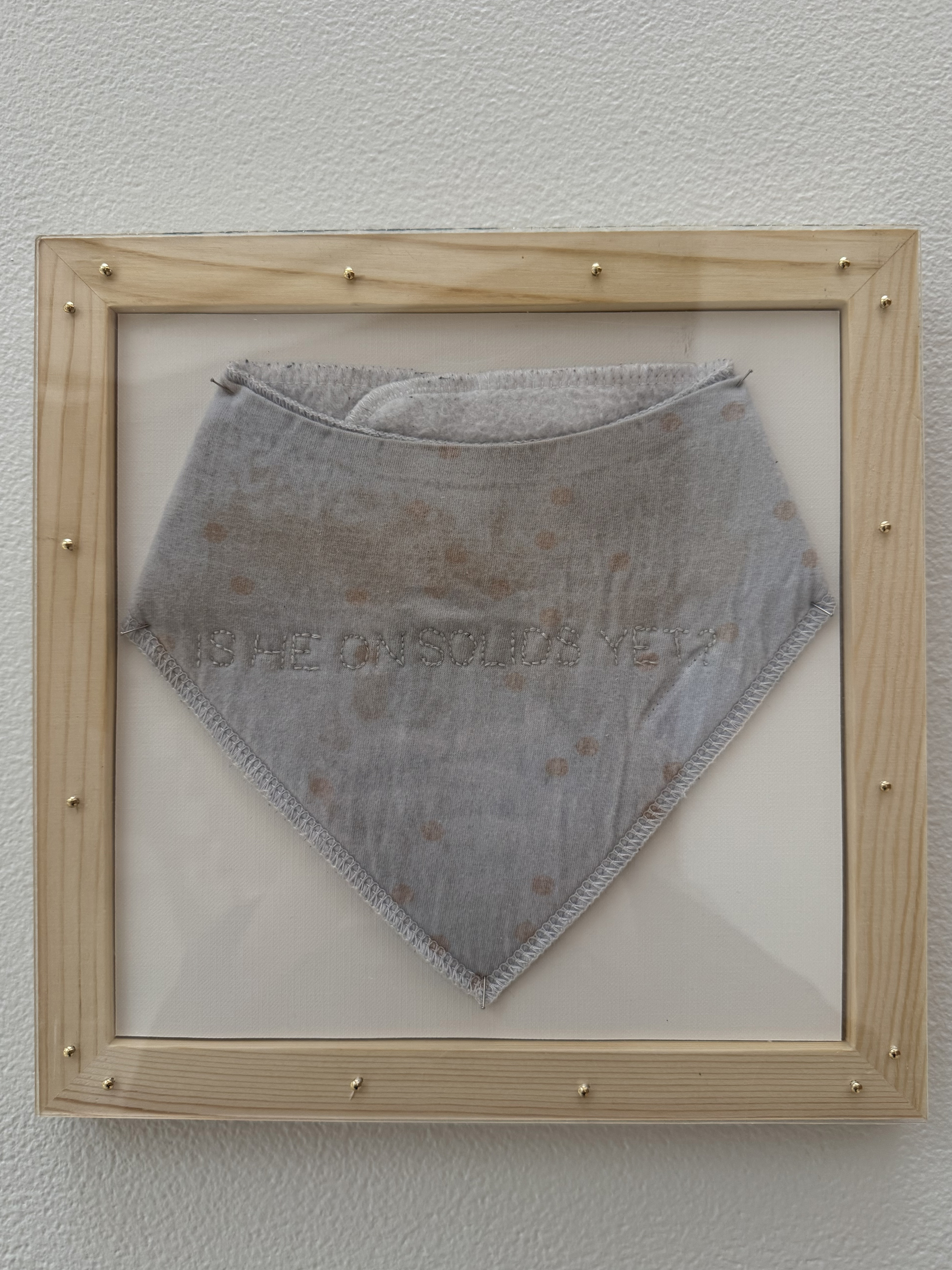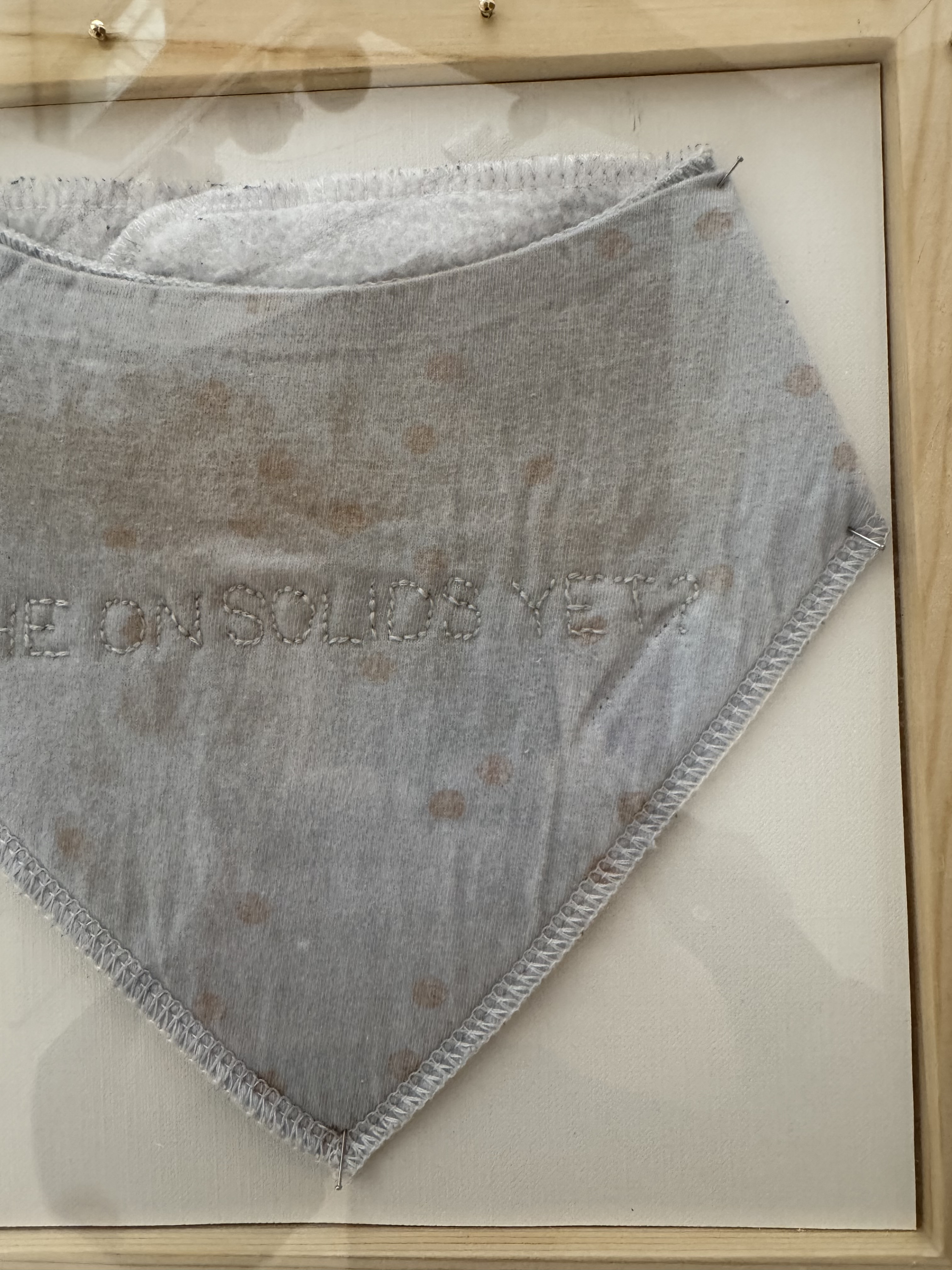 Embroidery thread on cloth baby bib, wood frame, plxiglass